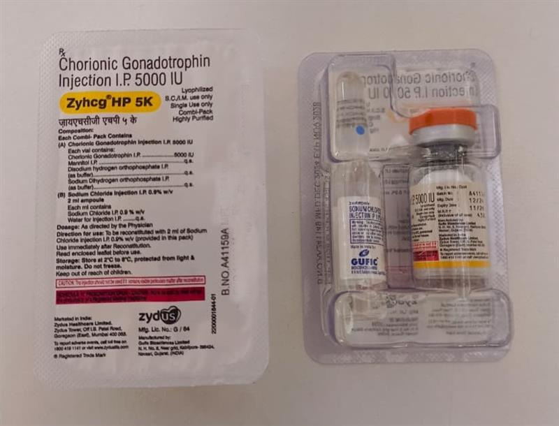 ZyhCG 5000iu manufactured by Gufic Biosciences Ltd. and marketed by German Remedies ( A division of Zydus Healthcare) (1 vial + 1 solvent in a box).